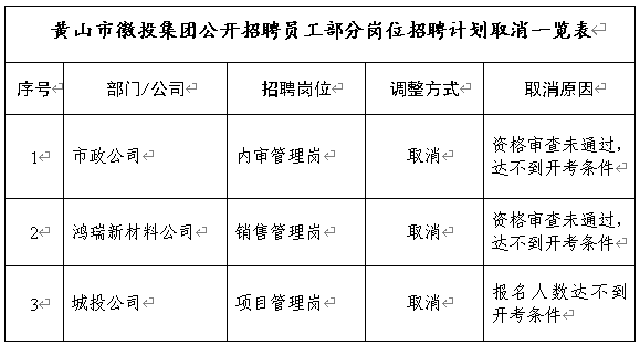黃山市徽城投資集團有限公司公開招聘員工的報名和資格初審工作現(xiàn)已全部結(jié)束,根據(jù)公司《招聘公告》要求,此次招聘因部分崗位不具備開考條件,經(jīng)研究決定予以取消。具體崗位招聘計劃取消情況如下: