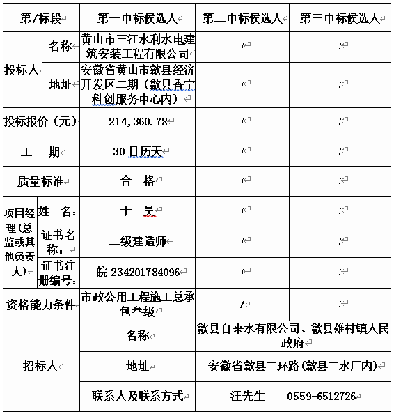 安徽華偉工程咨詢有限公司受歙縣自來水有限公司、歙縣雄村鎮(zhèn)人民政府的委托,對(HJSGC2020HWS001、歙縣雄村鎮(zhèn)雄村山斗組農(nóng)飲水附屬土建工程)進行(小型項目招標),本項目于(2020年3月02日)在(歙縣自來水有限公司三樓會議室)開標、評標,現(xiàn)根據(jù)有關法律、法規(guī)要求,對中標候選人進行公示。