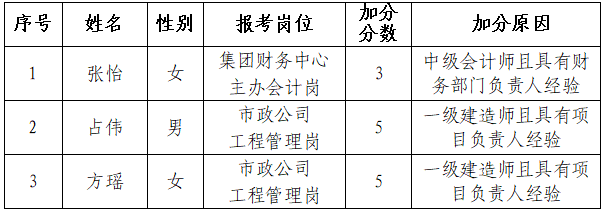 根據(jù)《黃山市徽城投資集團(tuán)有限公司招聘公告》(2020年7月23日)規(guī)定,“對報(bào)名參加主辦會(huì)計(jì)崗位的考生如持有中級會(huì)計(jì)師及以上證書且具有財(cái)務(wù)部門負(fù)責(zé)人經(jīng)驗(yàn)的(任職企業(yè)的注冊資本需為1千萬元及以上),給予總成績3分的加分。對報(bào)名參加工程管理崗位的考生如持有一級建造師證書,給予總成績2分的加分;如持有一級建造師證書且具有項(xiàng)目部負(fù)責(zé)人經(jīng)驗(yàn)的(任職企業(yè)的注冊資本需為1千萬元及以上),給予總成績5分的加分”?,F(xiàn)對報(bào)考人員申請加分的審核工作已全部結(jié)束,經(jīng)審核符合加分條件的人員共3人,現(xiàn)予以公示,接受社會(huì)監(jiān)督。
