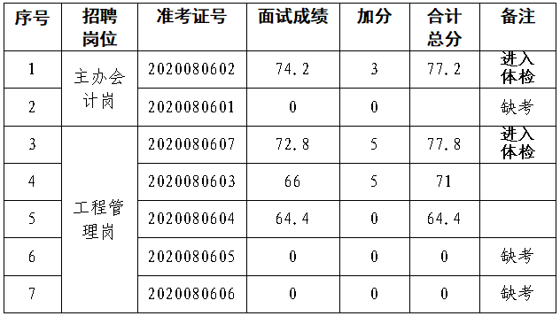 根據(jù)《黃山市徽城投資集團(tuán)有限公司招聘考試公告》,面試工作已于2020年8月8日結(jié)束,現(xiàn)將考生的成績予以公告: